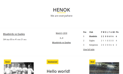 主题预览 点击下载 版本: 1.0.0 WordPress版本: 5.0或更高 PHP版本: 7.0或更高版本 Henok可用于博客和体育相关网站。该主题支持Sportspress插件,但没有它也可以正常运行。 Henok的默认颜色为白色,黑色和黄色,颜色可根据您的团队颜色进行定制。页面顶部有一个可选菜单和几个小部件区域。支持宽和全宽块。