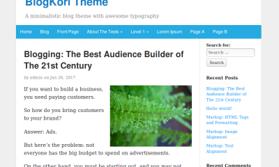 主题预览 点击下载 版本: 1.3.7 主题主页 {v1.3.6中的新功能:添加了更改主题自定义程序菜单中默认配色方案和链接颜色的选项。} BlogKori是一个完全响应的极简主义博客WordPress主题,适用于个人博客,摄影博客或商业博主。如果你是一个作家,旅行家,冒险家,艺术家,你有一个博客,那么这是一个完美的博客。 BlogKori是一个干净简单的设计与令人敬畏的排版。主题包含自定义徽标,标题,自定义背景图像,您可以从主题自定义程序选项轻松设置。它有Google Analytics跟踪框。您也可以根据自己的喜好更改此设计的默认颜色方案。该主题还具有下拉菜单,右侧边栏区域,线程评论选项和粘贴帖子。将精选图片添加到您的博客帖子中,让您的读者喜欢您的博客。这个主题建立在移动响应的bootstrap框架之上。这是一个轻量级的主题与HTML5标准标记,使其SEO友好。