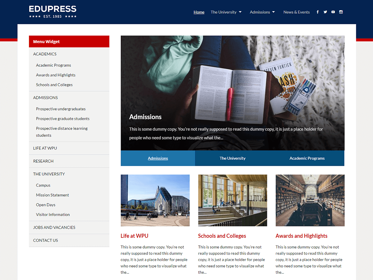 主题预览 点击下载 版本: 1.4 主题主页 EduPress是具有两列布局的现代主题。它最适合教育,商业,企业和非营利性网站。首页显示带有2-4个特色页面的标签式幻灯片,可以使用您的最新帖子或静态页面。