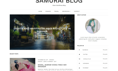 主题预览 点击下载 版本: 1.0.7 主题主页 Samurai是最小的博客主题。这个响应主题最适合用于博客,旅游,信息和生活方式的教练。它提供了改变整个网站的颜色,作者简介小部件,社交链接以连接社交网站和更多的选项.Samurai博客主题包含相关的帖子,特色Section.It支持流行的插件WooCommerce,联系表格7,简易数字点击下载。