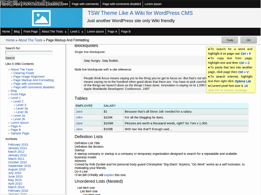 主题预览 点击下载 版本: 1.3 主题主页 TSW主题,就像一个Wiki,看起来像一个维基,并具有维基类型的功能。管理员的主题选项包括:设置字体大小,从9像素到25;选择您喜欢的链接颜色;设置标题图像。前端有一个可滚动的侧边栏,它是页面菜单,默认情况下以层次结构显示页面。或者,您可以添加任何您喜欢的WP小部件。左侧边栏和右侧内容这两个部分都单独滚动,以帮助用户浏览包含大量内容的网站。标题以不透明度固定,以便内容可见地滚动。两个菜单是顺畅的下拉菜单。主题包含一个工具栏,显示面包屑页面跟踪和用户工具框。现在使用Video Widget,您可以添加到工具箱中。