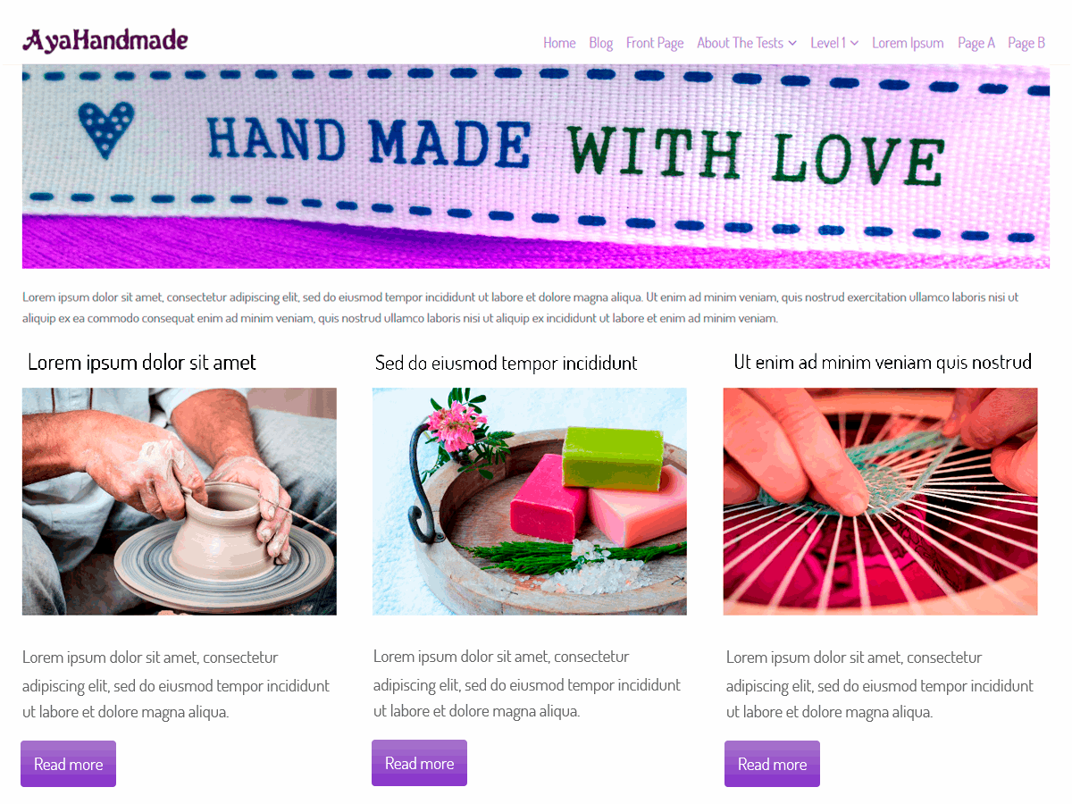 主题预览 点击下载 版本: 1.0.7 主题主页 AyaHandmade是完全响应的WordPress主题,适用于手工制作的东西和工艺品网站和博客。功能包括动画显示效果,自定义徽标,多级下拉菜单,自定义背景,全宽页面模板,窗口小部件区域:列上方的主页,3个主页列,右侧边栏,页脚菜单,页脚版权文本,搜索引擎优化的多浏览器支持,Gutenberg兼容,翻译就绪等