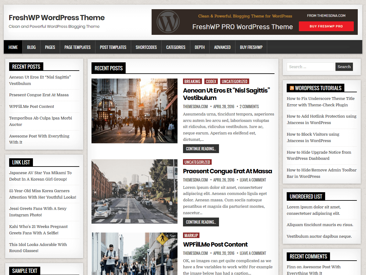 主题预览 点击下载 版本: 1.0.1 主题主页 FreshWP是一个干净,优雅,易于使用,100%响应,3列博客主题的WordPress。它有主题选项来自定义主题的各个方面,并具有干净的帖子摘要,帖子/页面的全宽布局,粘性菜单和侧边栏,标题小部件,左右侧边栏,4列页脚,社交按钮,滚动到 – 顶部按钮等等。使用FreshWP PRO版本,您可以获得许多颜色和字体选项,8种不同的帖子样式,8个特色帖子小部件,标签小部件和更多小部件,10多个布局选项,10多个自定义页面模板,10个以上自定义帖子模板,标题布局,社交/ share按钮,相关帖子和更多功能。免费版演示:https://themesdna.com/demo/freshwp/