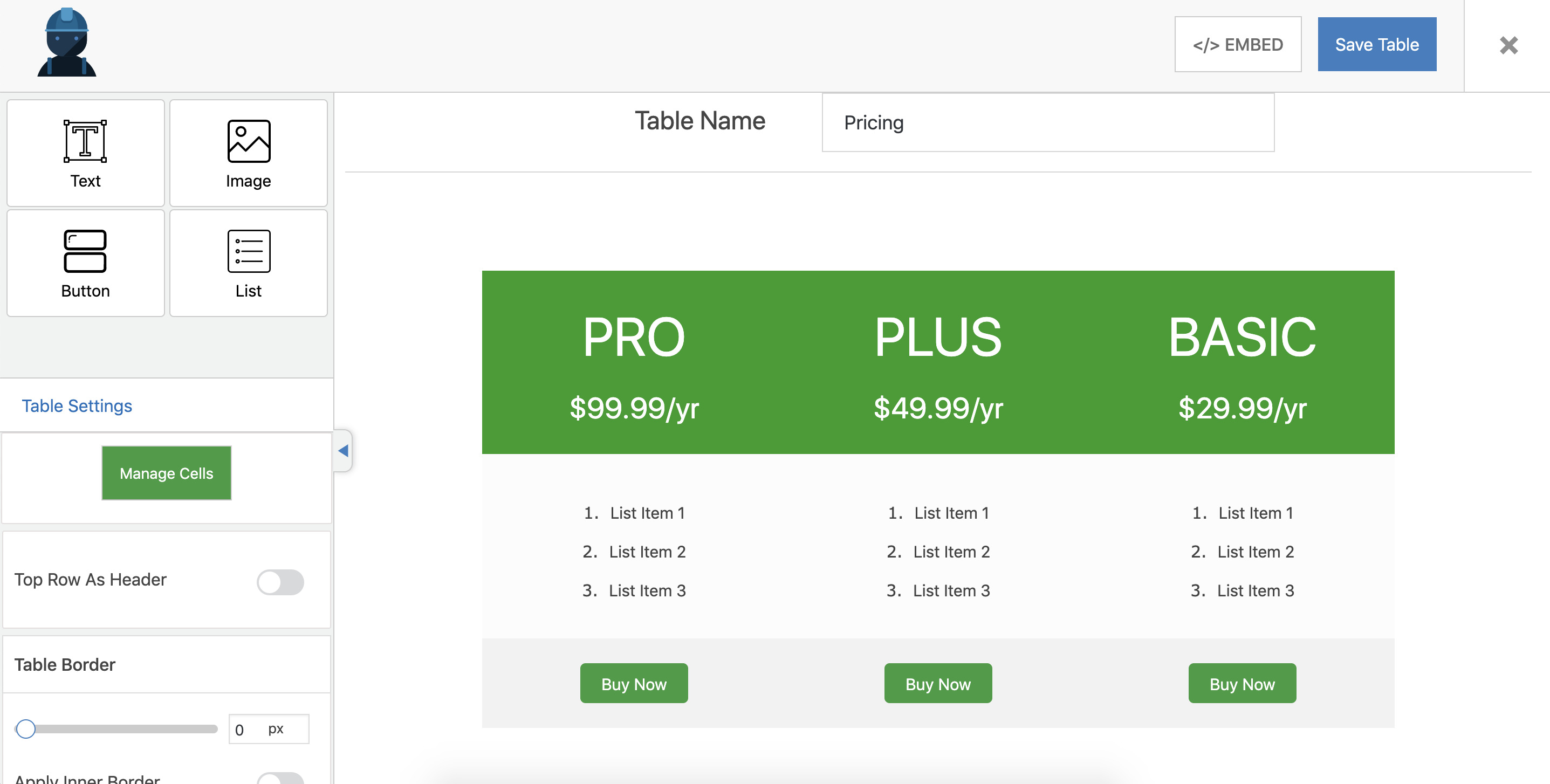点击下载 WP表生成器 插件描述 WP表生成器是WordPress的拖放表生成器插件。使用WP Table Builder创建响应表非常容易。 WP Table Builder非常适合创建比较表,定价表,列表等等。 该修建器现在有4个元素。您可以在表中添加以下元素: TextImageListButton 所有元素都带有自己的自定义选项。 我们有一个单元格管理模式,它带有添加新行,添加新列,合并单元格,拆分单元格等选项。 如何使用 安装插件后,您将看到“表生成器”菜单。转到表生成器>添新。 您可以选择列号和行号。选择后,单击“生成”。该表将生成。 然后,您可以将左侧面板中的元素拖放到表格单元格中。完成添加和编辑元素后,单击“保存”以保存表格。 保存表格后,您可以使用短代码将其嵌入到帖子和页面中。点击顶部的“嵌入”以获取短代码。 您还可以从“表格生成器”菜单下的“所有表格”列表中获取短代码。 屏幕截图 表格浏览器界面。 细胞管理模式。 表短消息弹出窗口。 FAQ 安装说明 请记住,您必须拥有PHP 5.6+才能使用此插件。 通过WordPress的插件页面上传插件zip文件,方法是单击“添加新”并从本地计算机中选择zip。通过WordPress中的插件菜单激活插件。 就是这样。你完成了!