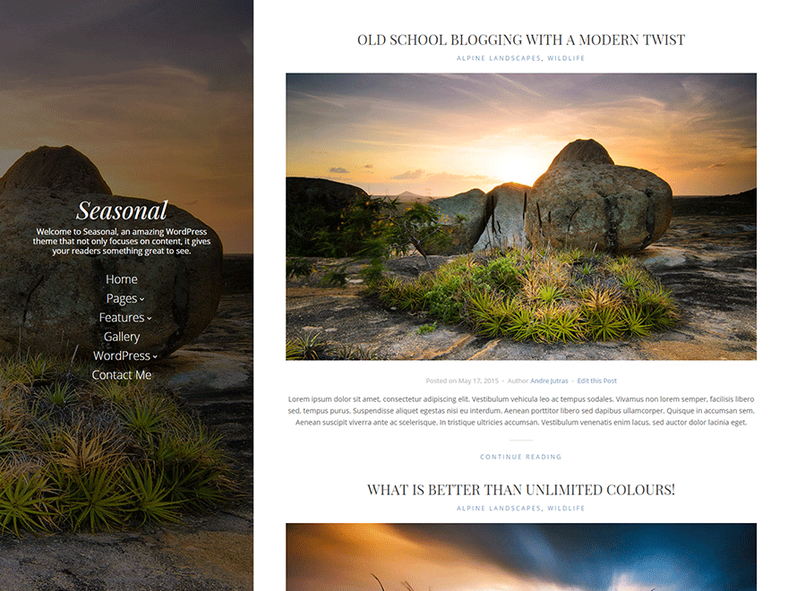 主题预览 点击下载 版本: 1.2.0 主题主页 Seasonal是一个简单但反应迅速的个人博客主题,其功能和风格选项将使任何博客纯粹主义者都喜欢写出精彩的文章。您的部分经验是选择在侧边栏上拥有坚实的背景色,或者如果您真的想要突出的东西,请插入一张带来视觉享受的照片,让读者喜爱。更改侧边栏的宽度或调整使侧边栏变暗或变亮的叠加层。 Seasonal带有更多功能,例如几种帖子格式,2种博客样式,5种侧边栏位置,使用内置定制器的无限颜色选择,显示或隐藏帖子中的各种元素等等…演示:http:// demo.shapedpixels.com/seasonal/