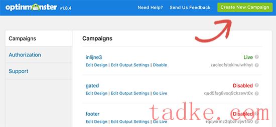 授权OptinMonster后,点击‘Create new campaign’按钮在顶部。