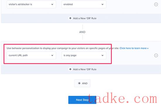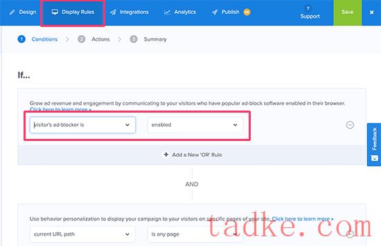 之后,你需要点击‘Display Rules’选项卡。在第一条规则下,你需要选择‘user has adblock enabled’。