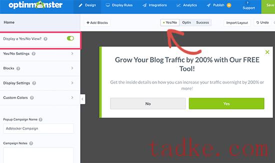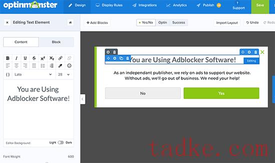 接下来,您需要单击是和否按钮来编辑它们的文本。我们将yes按钮改为“我已经禁用了AdBlock”,no按钮改为“我会考虑一下”。