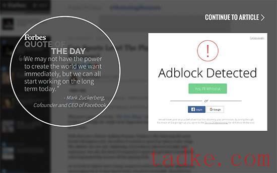 这种反广告屏蔽方法是相当激进的,它会让用户离开你的网站。研究表明,77%的广告屏蔽用户离开带有广告屏蔽墙的网站。