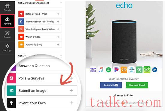 现在,让我们添加一些动作。赠送行为是用户参加比赛的方式,比如在社交媒体上分享一篇文章,或者订阅你的播客。