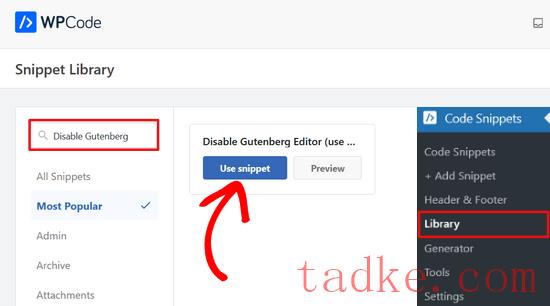 下一步,搜索‘禁用古腾堡编辑器(使用经典编辑器)’使用snippet’按钮。