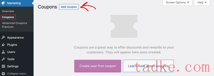 激活后,您需要访问WordPress仪表板中的Marketing»coupon 页面。接下来,您需要点击“添加优惠券”按钮来创建一个新的优惠券。