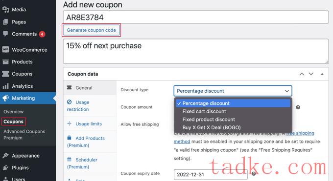 注意:如果您使用的是旧版本的WooCommerce,那么您可能需要导航到WooCommerce»coupon 。