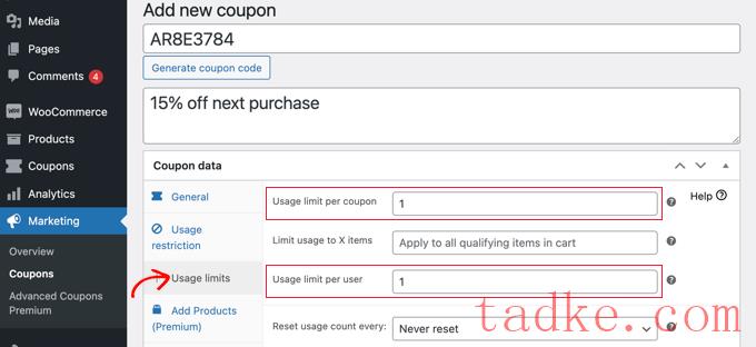 您现在应该在’ Usage limit per user ‘字段中输入数字1。这将确保每个收到优惠券代码的客户只能使用一次。