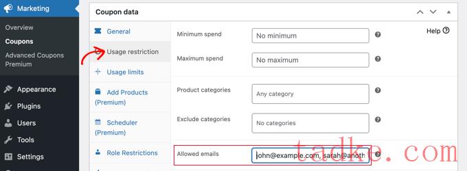 您应该仍然在“添加新优惠券”页面。在“优惠券数据”部分,您需要单击“使用限制”选项卡。现在你需要向下滚动到“允许的电子邮件”字段。