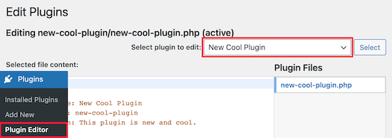 之后,从‘选择要编辑的插件:’下拉列表,点击‘按钮。