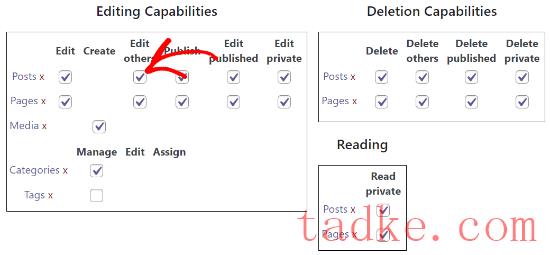 一旦你选择了’编辑器’角色,您需要确保‘Edit others’复选框在编辑功能设置下启用。