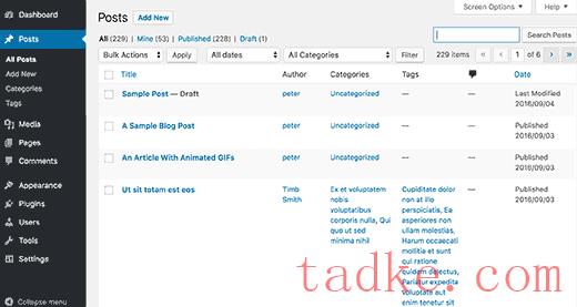 WordPress管理区有一个非常直接和易于使用的布局。您可以单击帖子或页面来访问这些帖子类型下的内容列表。