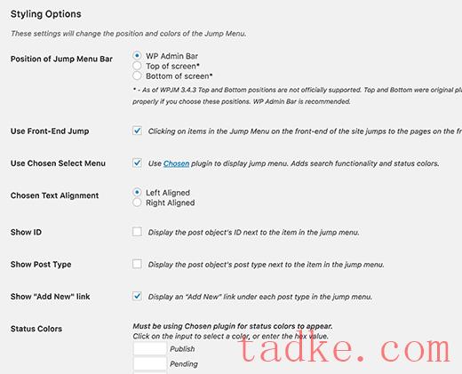 您可以选择待定,草稿或已发布的帖子的状态颜色。在其他选项中,您可以显示帖子id,设置文本对齐方式,显示/隐藏前端跳转菜单等。