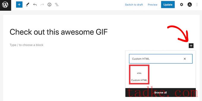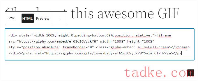 现在你可以简单地将你的GIF嵌入代码粘贴到自定义HTML块中。