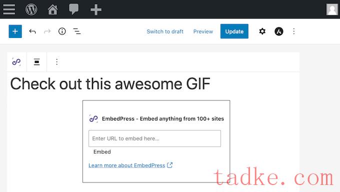 这里只需将GIF的URL粘贴到EmbedPress框中。最后点击嵌入。