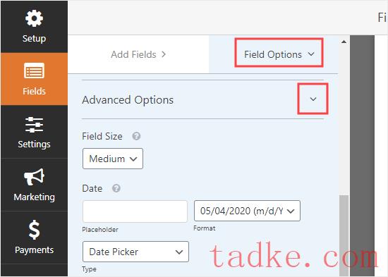 您可能想要更改日期选择器的工作方式。这在WPForms中很容易做到。在“字段选项”选项卡中,向下滚动到“高级选项”。