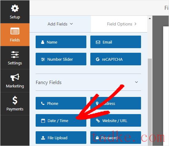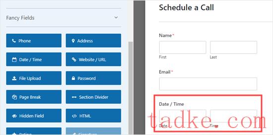 在表单构建器中,您将在右列中看到可以添加到表单中的所有字段。向下滚动到Fancy Fields部分,您将看到Date / Time字段。