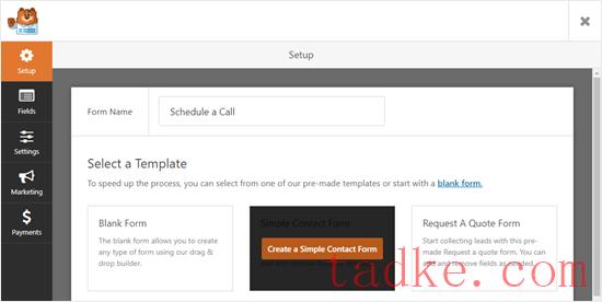 将出现WPForms生成器。首先,为表单键入一个名称。然后,将鼠标光标悬停在模板上,并单击按钮选择该模板。我们将使用Simple Contact Form模板。