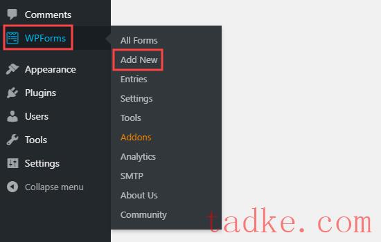激活插件后,转到WPForms »在你的WordPress仪表板中添加New