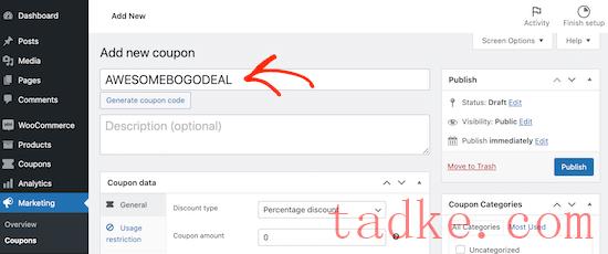 这也将成为实际的优惠券,顾客将使用它来领取免费礼物,所以使用一些容易让购物者记住和输入的东西是一个好主意。你也可以使用一些描述你的报价的东西,比如‘BOGODEAL’或’
