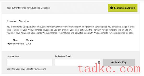 您现在可以输入您的许可证密钥和用于购买高级优惠券的电子邮件地址。您可以通过登录您在高级优惠券网站上的帐户找到这些信息。