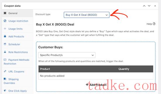 在‘Customer Buys’部分,您可以通过设置特定的触发器创建一系列不同的买一送一的交易。这样,当客户向购物车中添加一个或多个产品时,您就可以自动触发交易。