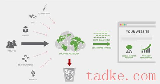 我们推荐使用Sucuri。他们是网站安全领域的行业领导者,也是市场上最好的WordPress防火墙。因为他们有一个DNS级别的网站防火墙,这意味着你的所有网站流量都会通过他们的代理,在那里不好的流量会被过滤掉。