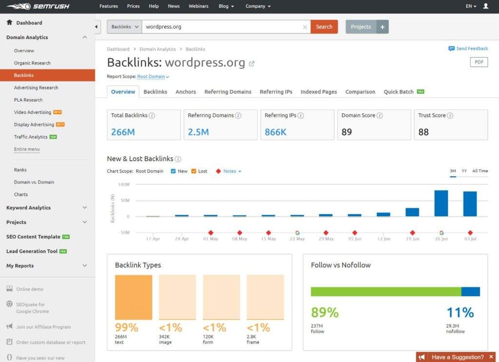 最后,SEMrush是一款面向数字营销专业人士的一体化竞争数据和分析工具。它没有上述工具所具有的强大的反向链接数据库,但它们在不断改进。绝对,一个检查。