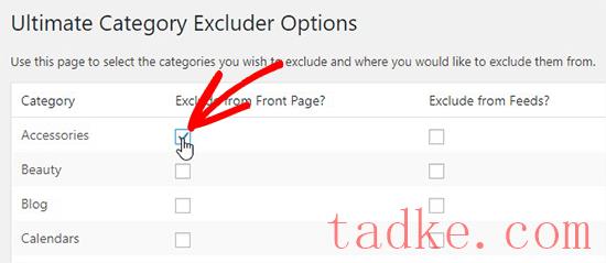 在这里,你只需勾选“从首页中排除”栏下的一个或多个类别即可。如果你愿意,你也可以从RSS提要、档案,甚至从WordPress搜索中排除该类别。