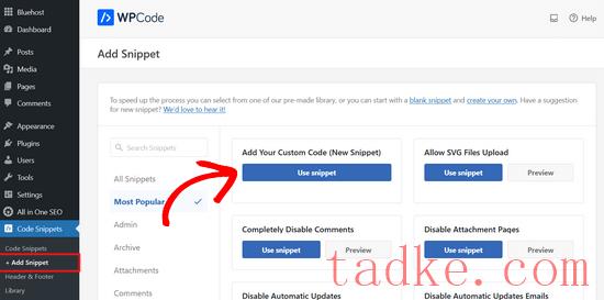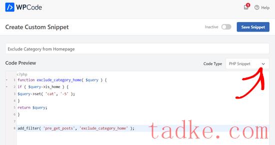 接下来,只需将上面的代码粘贴到“代码预览”框中,然后从下拉菜单中选择“PHP代码片段”作为代码类型。