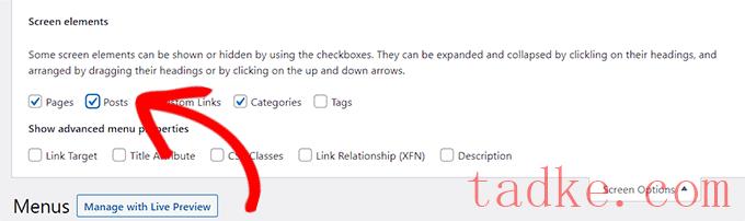 这将打开“Screen Elements”提示。在这里,勾选“帖子”框,将其显示在“添加菜单项”部分。
