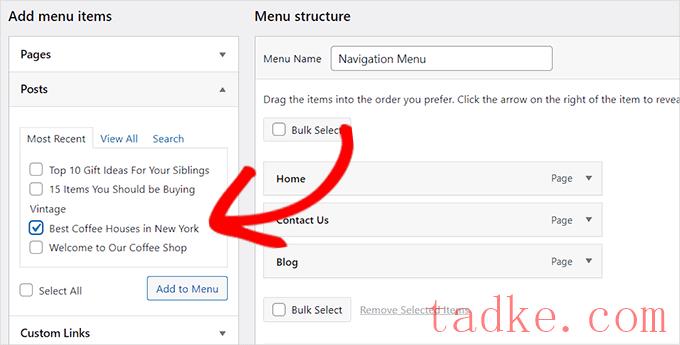 只需选中您想要在导航菜单上显示的特定帖子,然后单击“添加到菜单”按钮。