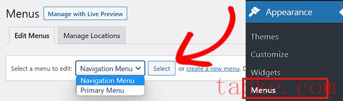如果你选择‘WordPress菜单’选项,那么你可以从下拉菜单中选择你在WordPress中创建的任何菜单。