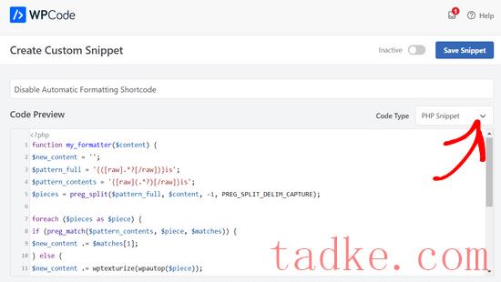 接下来,您可以为您的代码片段添加标题,它可以是任何帮助您记住代码用途的东西。然后,只需将上面的代码粘贴到“代码预览”框中,并从下拉菜单中选择“PHP代码片段”作为代码类型。