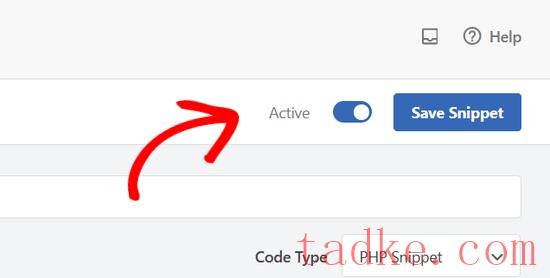 最后,将开关从“非活动”切换到“活动”,然后单击页面顶部的“保存代码片段”按钮。