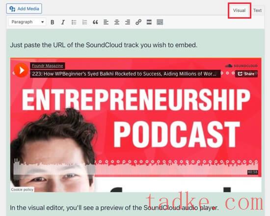 如果您使用的是可视化编辑器,那么您将在WordPress中看到SoundCloud音频音乐播放器的预览。