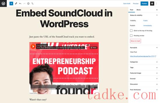 只要你粘贴SoundCloud URL,WordPress就会获取嵌入代码,并显示音频播放器和曲目。