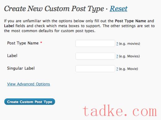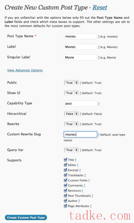接下来,您可以选择几个选项进行填写。WordPress将使用“帖子类型名称”来查询来自该post_type的所有帖子。“标签”将显示在仪表板的侧边栏上,就像常规的“帖子”菜单一样。如果展开“查看高级选项”,您将看到更多可以配置的选项。大多数都是不言而喻的,比如“Public”和“Show UI”。第一个参数设置为True时允许在侧边栏上显示自定义POST类型菜单,另一个参数(Show UI)设置为True时生成菜单面板。