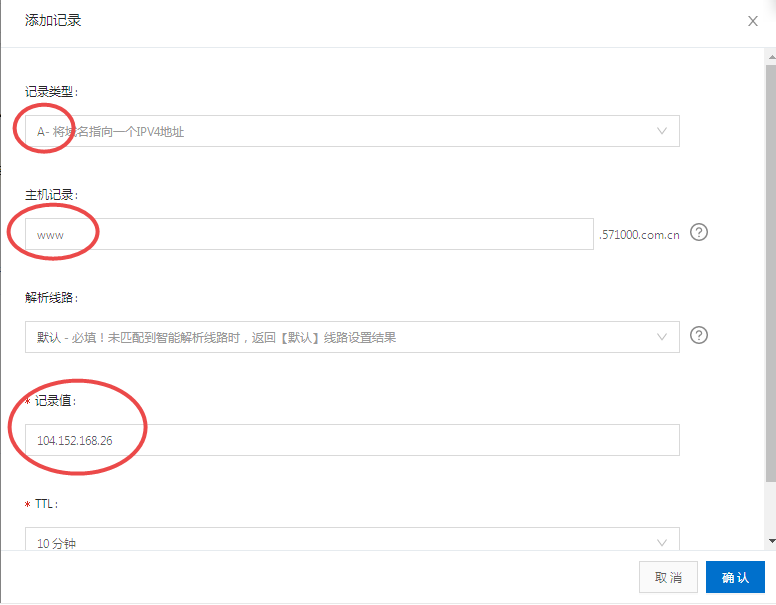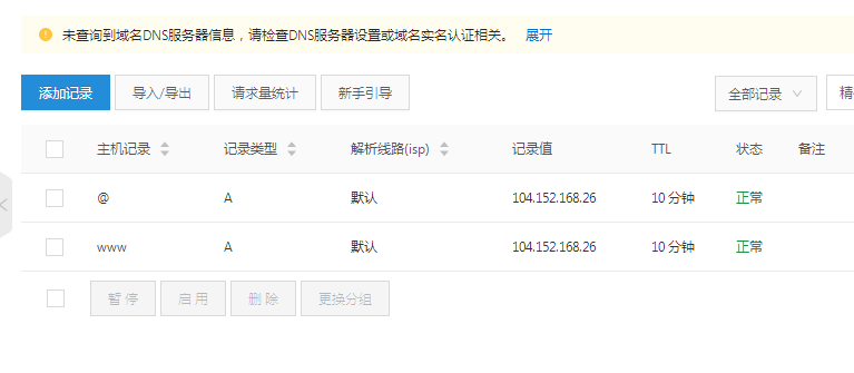 这里以阿里云的域名为演示,但其他的也类似,域名增加二个“A”值,一个名称是“@” 和另一个是“www”就这二个就行了!