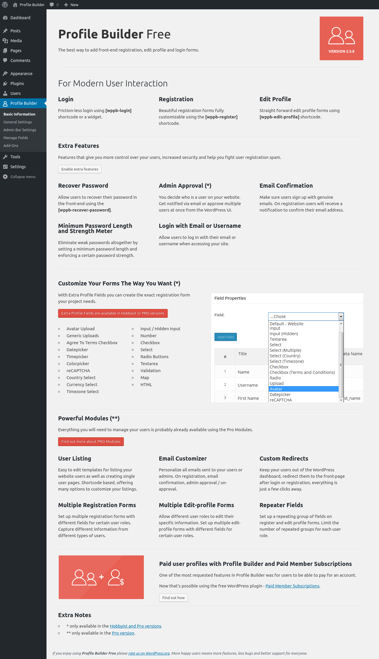 专业版具有以下额外功能:创建额外用户字段(标题,输入,隐藏输入,数字,复选框,同意条款复选框,单选按钮,Textarea,WYSIWYG,reCAPTCHA,上传字段,选择,用户角色选择,国家选择,时区选择,头像上传,地图,HTML,电话,Datepicker,Timepicker,Colorpicker,自定义验证字段,货币选择,CPT选择)添加头像上传用户支持条件FieldsFront-end用户列表(完全可自定义,包括排序)创建多个用户列表自定义重定向多个注册表单(为特定用户角色设置具有不同配置文件字段的多个注册表单)多个编辑个人资料FormsAdmin ApprovalEmail定制程序(个性化发送给您的用户或管理员的所有电子邮件;自定义默认的WordPress注册电子邮件)高级模块(例如自定义重定向,用户列表,多个注册rms等)访问支持和文档1更新年/优先支持